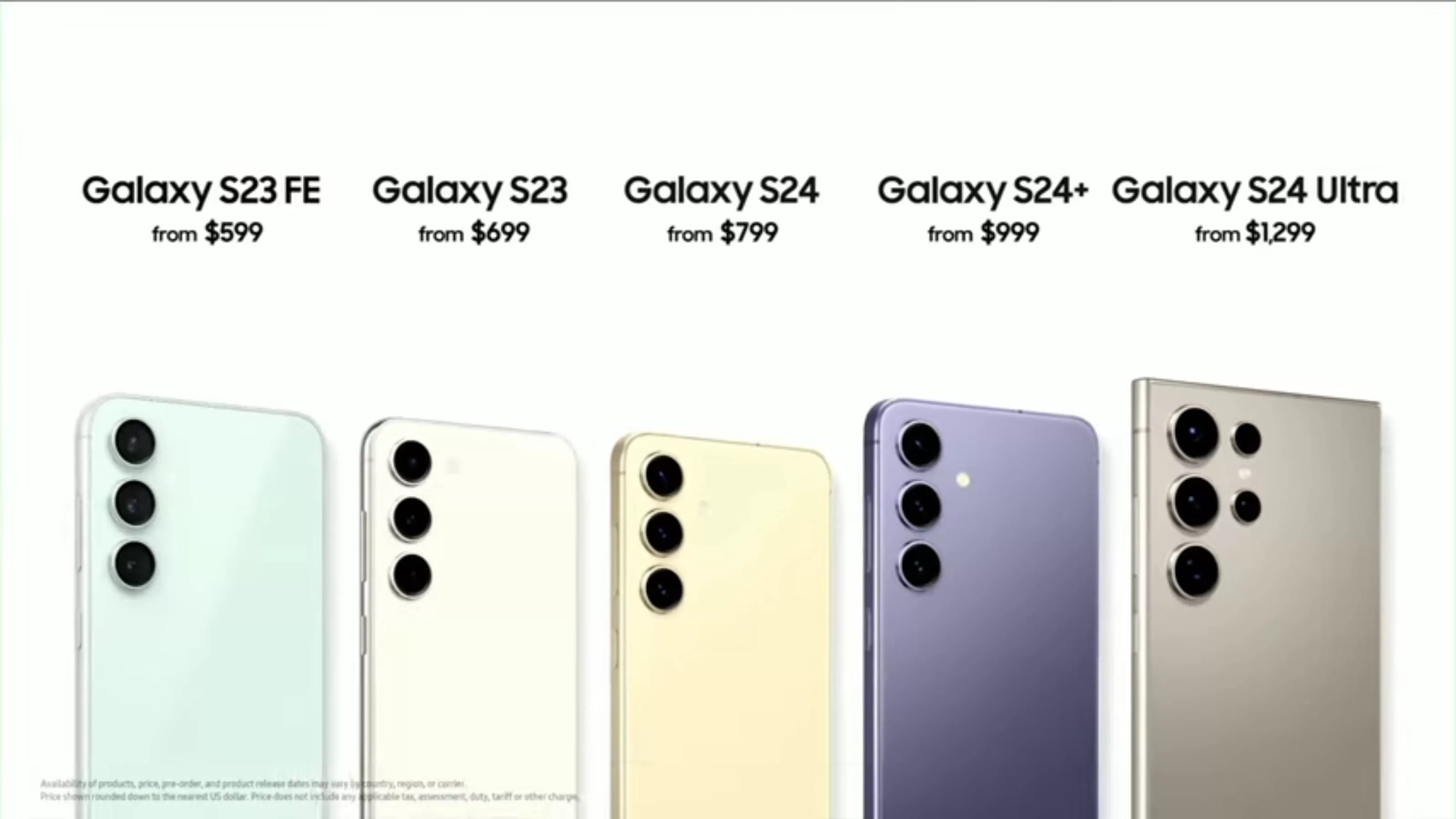Colores inspirados en minerales terrestres para estética refinada. Incluyen: Gris Titanio, Negro Titanio, Violeta Titanio y Amarillo Titanio. En el Galaxy S24+ y el Galaxy S24, los colores incluyen: Negro Ónix, Gris Mármol, Violeta Cobalto y Amarillo Ámbar.