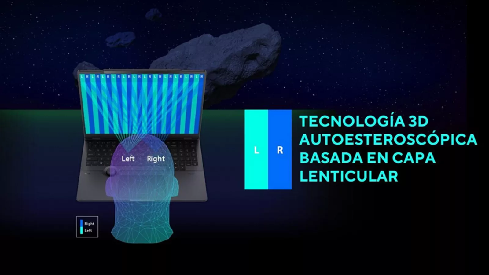 Esto es posible gracias a que el equipo posee dos cámaras que realizan un seguimiento ocular, para que la pantalla con tecnología autoestereoscópica entrelace las imágenes que recibe cada ojo y así generar una sensación de profundidad.