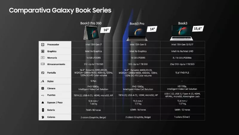 Todas las notebooks de la serie Galaxy Book3 vienen equipadas con el sistema operativo Windows 11 y la última generación (13°) de procesadores Intel, con versiones de Core i3, i5 e i7 para Galaxy Book3, Evo i5 para Galaxy Book3 Pro y Evo i7 para Galaxy Book3 Pro 360. Además, es posible elegir versiones de 16gb de RAM y 512gb de almacenamiento para los tres modelos.